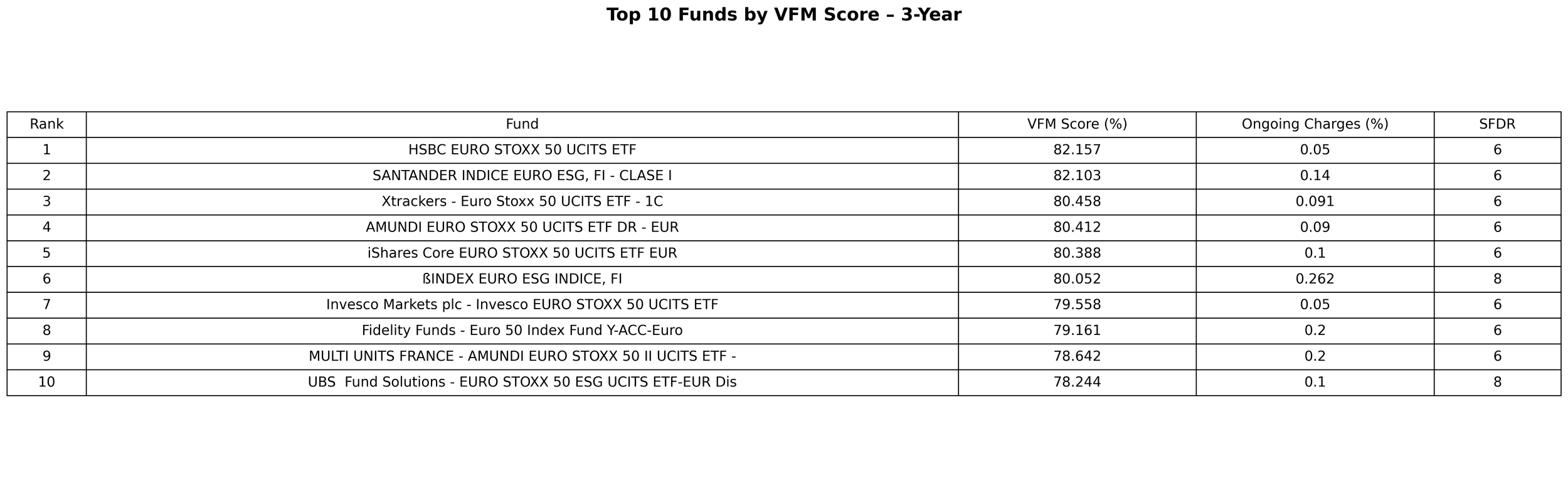 · The top ten funds by VFM charge well below 0.3% in annual fees, enabling strong net returns relative to cost (see table). These are predominantly ultra-low-cost index funds targeting Eurozone equities and have ongoing charges in the 0.05%–0.26% range.